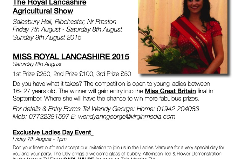 Exclusive Ladies Day Event 7th August 2015 1PM - 5pm The Ladies Marquee at The Royal Lancashire Agricultural Show Salesbury Hall, Ribchester, Nr Preston Friday 7th August - Saturday 8th August Sunday 9th August 2015 MISS ROYAL LANCASHIRE 2015
